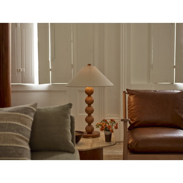 Inspired by the recent revival of the bobbin – an ornate 17th century decorative finish - Dawes is a an oversized statement lamp perfect for a side or console table. Crafted from solid ash with a honey stain that accentuates the wood’s grain, it’s finished with a bottom rim of contemporary plated brass. A handcrafted neutral linen shade completes the look.
