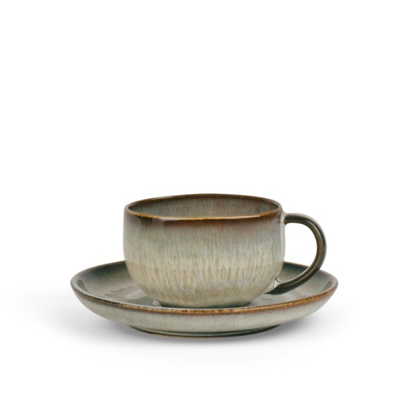 Cet ensemble tasse et soucoupe est fabriqué en grès résistant au Portugal, un pays réputé pour la qualité de ses céramiques. Finie à la main avec un vernis réactif dans une teinte bleu lin unique, chaque pièce présente un aspect artisanal distinctif. Idéal pour une réunion de famille ou un goûter détendu.