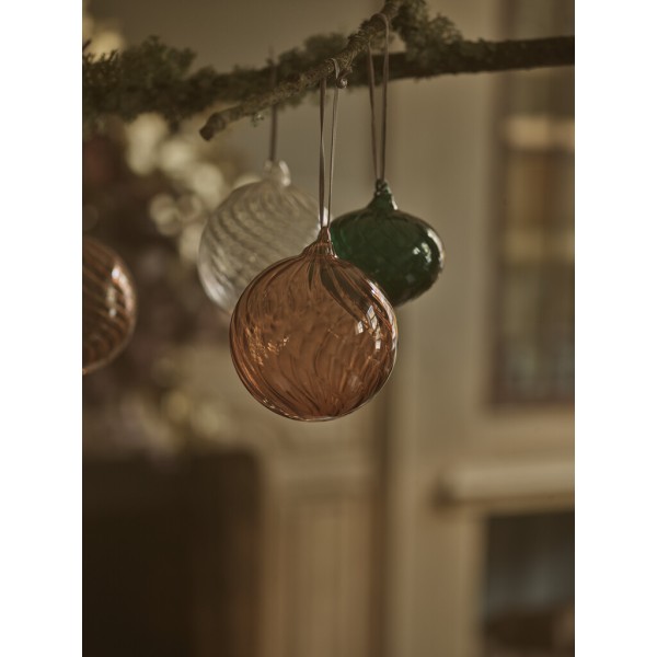 Les boules Avery à texture ondulée sont soufflées à la bouche dans une forme ronde classique. Fabriquées en verre, elles reflètent magnifiquement les lumières scintillantes des sapins de Noël, apportant un charme d'inspiration vintage à la décoration festive. Cet ensemble est disponible en couleur Apricot, un ton pêche doux et précieux, et est suspendu à un ruban de velours.