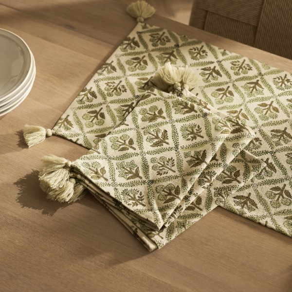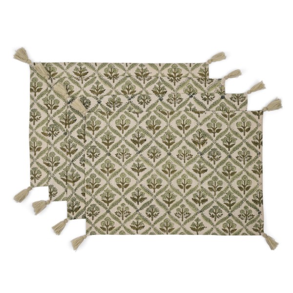 Fabriqués à partir d'un mélange de coton et de lin, ces sets de table d'inspiration botanique sont traditionnellement imprimés au bloc par des artisans qualifiés, puis lavés pour obtenir un fini merveilleusement doux. La teinte vert olive apporte une chaleur douce et naturelle à votre table, tandis que les délicates franges à chaque coin ajoutent une touche décorative subtile.