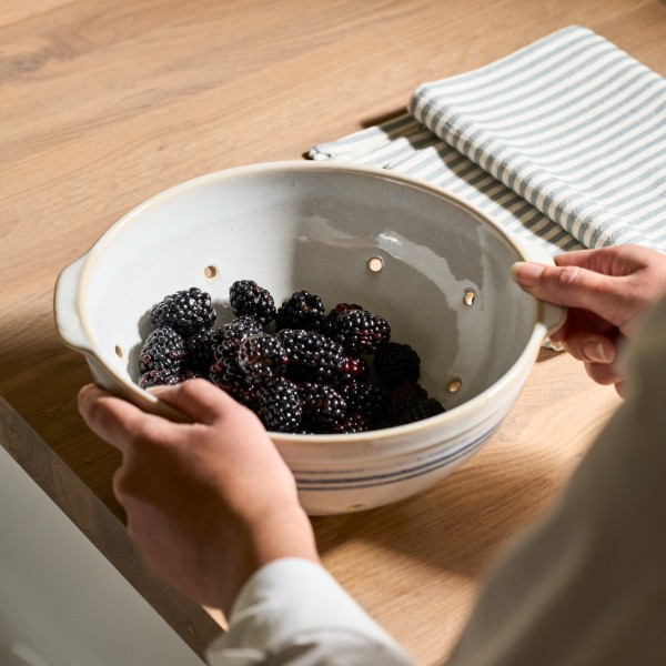 Fabriqué au Portugal en grès lourd et durable, le passoire Melbury est un indispensable de la cuisine. Peint à la main par des artisans qualifiés avec une rayure bleu marine rustique, elle apporte un charme artisanal unique à votre cuisine. Équipée de petites poignées pour un versement facile, elle est également dotée de petits pieds pour être posée dans l’évier.